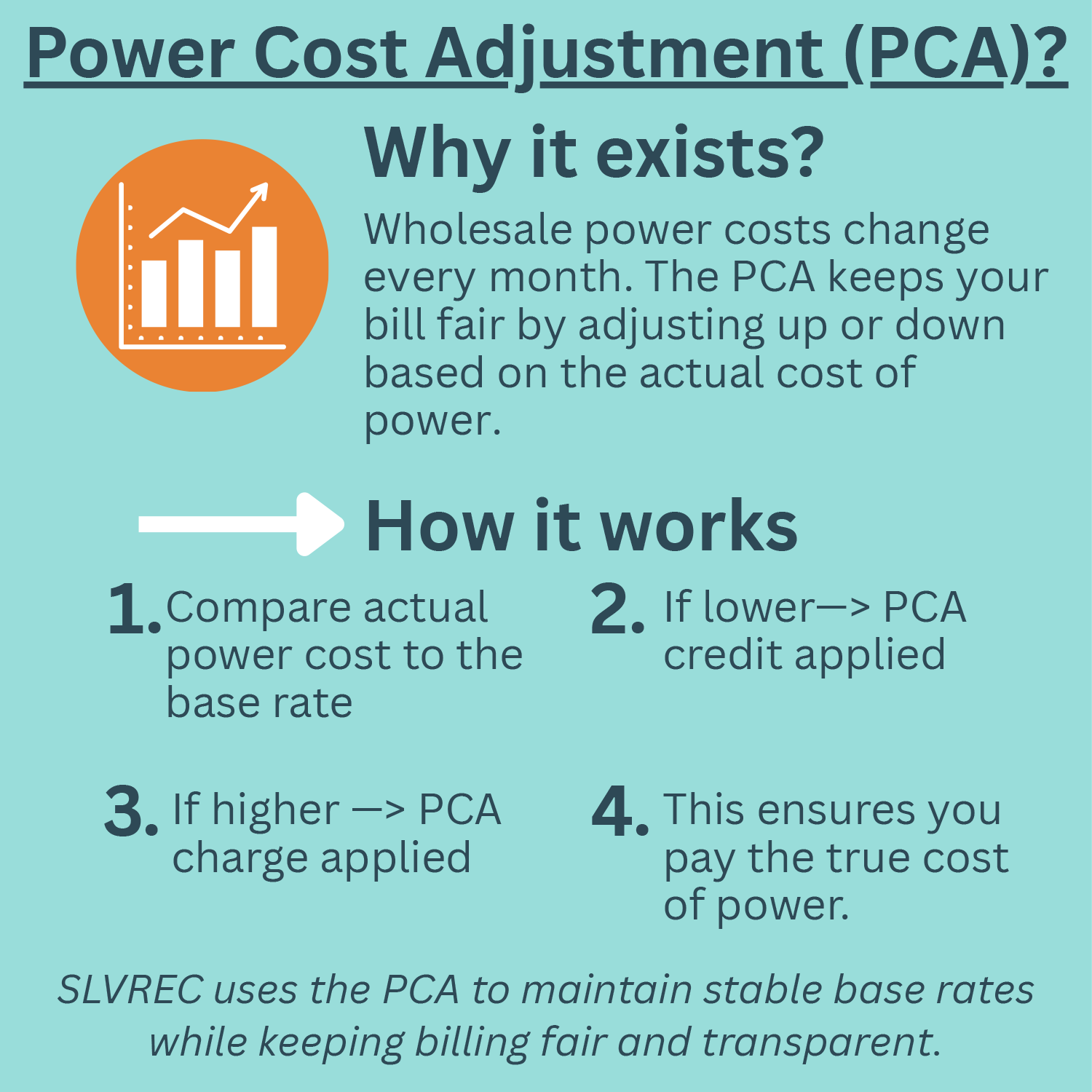 As mentioned in previous articles, the PCA is necessary to cover fluctuating whole-sale power costs from Tri-State Generation and Transmission, our energy provider.
