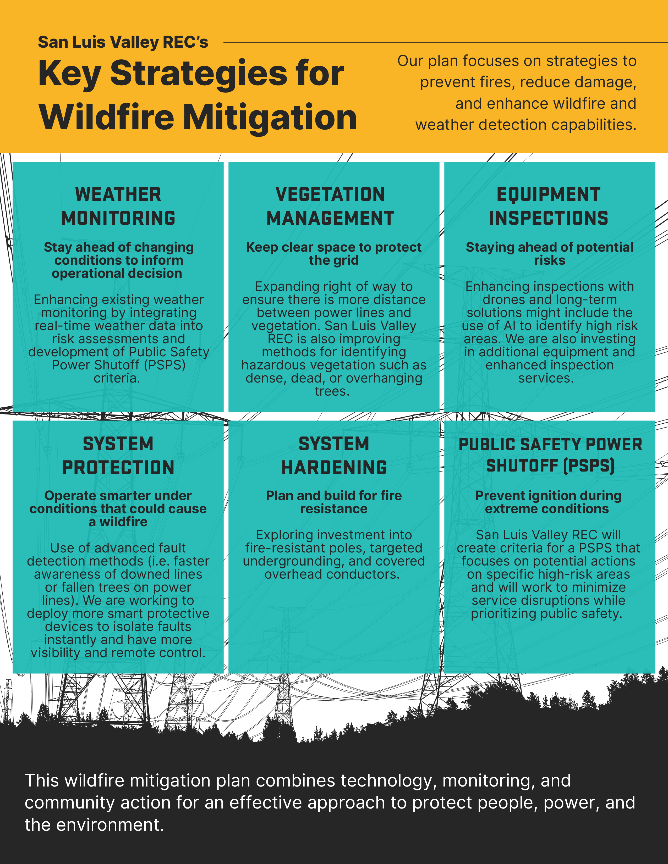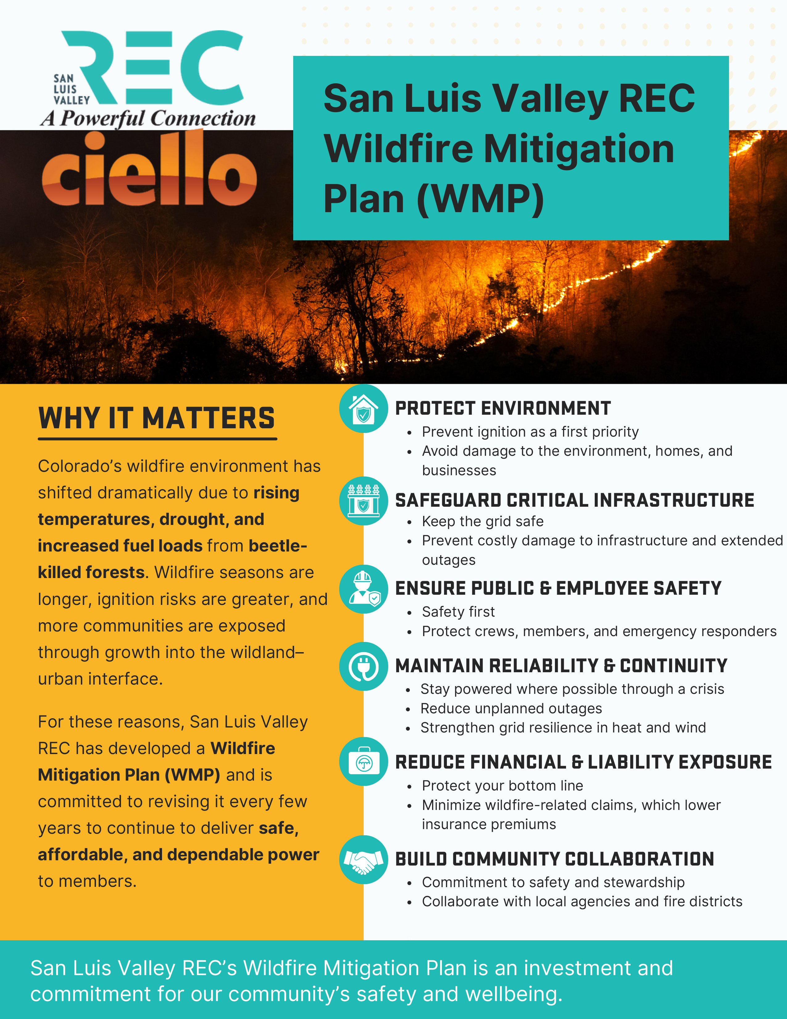 The infographic below provides a visual overview of San Luis Valley REC’s Wildfire Mitigation Plan, summarizing the key strategies, guiding priorities, and community-focused goals that drive our approach to reducing wildfire risk.